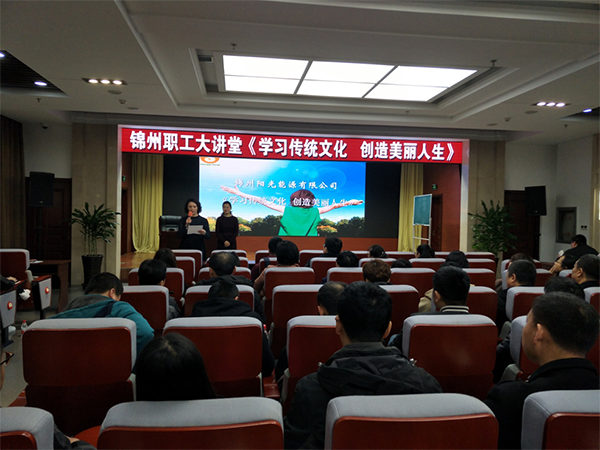 為弘揚(yáng)優(yōu)秀傳統(tǒng)文化,傳承國(guó)學(xué)先賢思想,提升干部職工思想道德境界,3月16日我司工會(huì)在錦州市職工會(huì)館四樓組織開(kāi)展《學(xué)習(xí)傳統(tǒng)文化、創(chuàng)造美麗人生》培訓(xùn)講座,集團(tuán)職能部門(mén)管理人員及各專(zhuān)業(yè)公司主管及以上人員、光伏行業(yè)各企業(yè)職工共計(jì)160人參加。