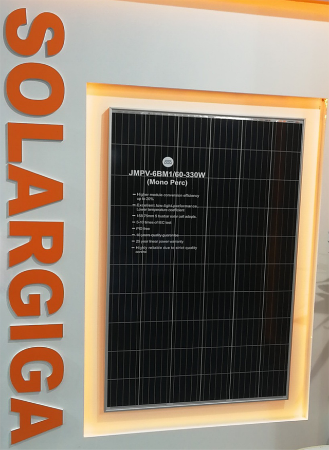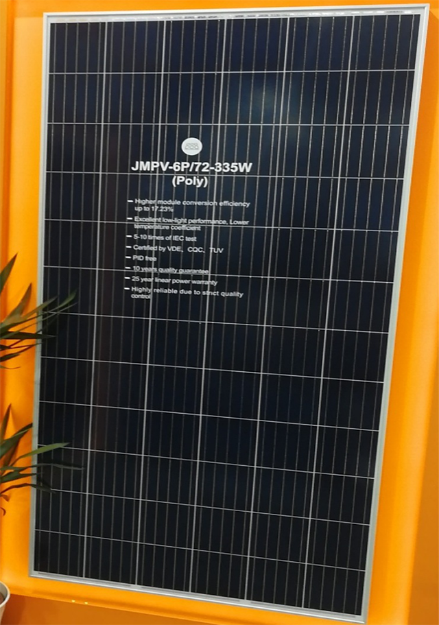 此次錦州陽光能源團(tuán)隊(duì)攜最新產(chǎn)品亮相A1-410展臺,備受全場關(guān)注。60片方單晶組件(Mono perc)(JMPV-6BM1/60-330W),72片多晶335W組件Poly(JMPV-6P/72-335W)等高效組件吸引了眾多參展觀眾。