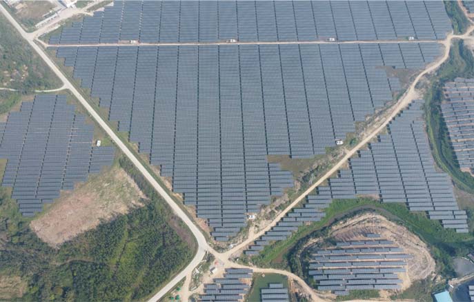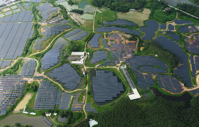 值得一提的是,廣東省開平市150MW光伏項(xiàng)目綜合采用了“農(nóng)光互補(bǔ)+漁光互補(bǔ)”新型發(fā)電模式——板上光伏發(fā)電,板下土地進(jìn)行農(nóng)業(yè)種植、板下水域進(jìn)行漁業(yè)養(yǎng)殖——滿足周邊用電需求的同時(shí),還實(shí)現(xiàn)了電力與農(nóng)業(yè)、漁業(yè)的有機(jī)結(jié)合,實(shí)現(xiàn)三重經(jīng)濟(jì)收益。從高空俯瞰,耕地、漁田與陽光組件交相輝映,波瀾壯闊。