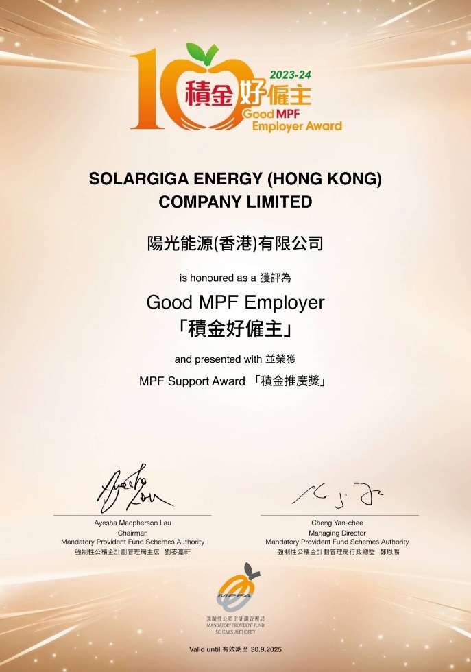 近日,陽光能源控股有限公司(以下簡稱“陽光能源”)旗下陽光能源(香港)有限公司憑借以人為本的理念和企業(yè)社會責任的踐行,被香港強制性公積金計劃管理局(MPFA)授予“積金好雇主”稱號和“積金推廣獎”榮譽,是陽光能源推進集團 ESG 工作的重要實踐,更是香港政府機構(gòu)對我司建設優(yōu)秀雇主品牌、踐行 ESG 理念工作的充分認可。